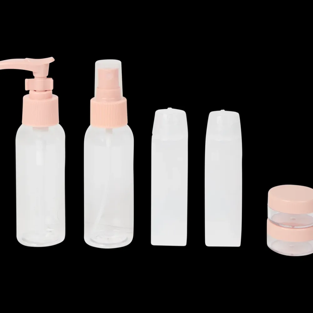 - Bevat navulbure kunststof flesjes, potjes en een pompflacon